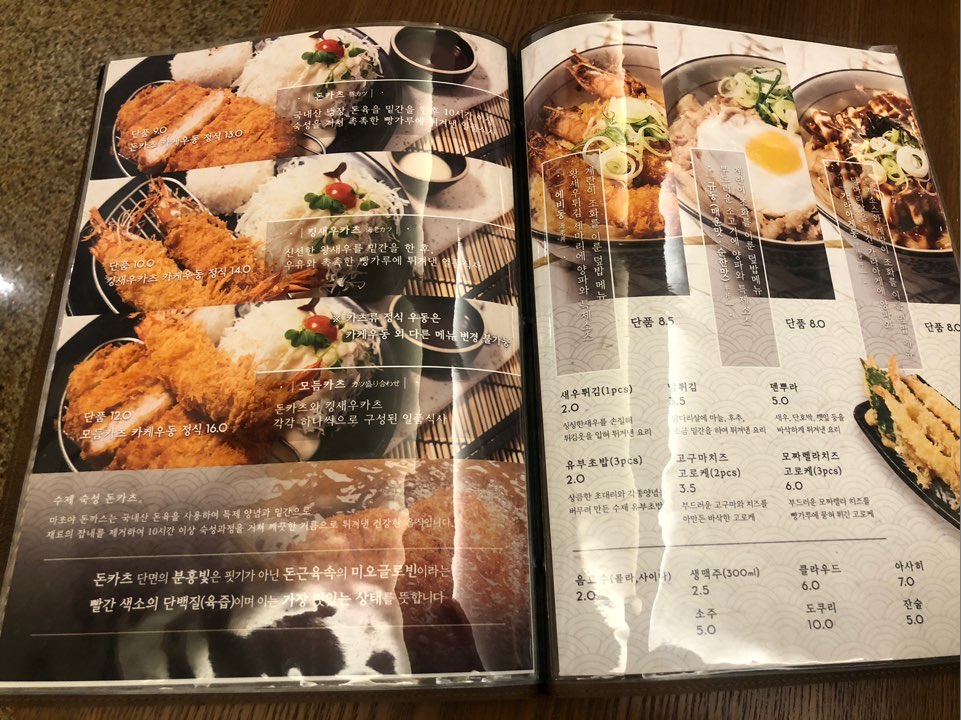 메뉴가 여러개로 나눠져 있는데 편하게 얘기하면 냉우동/비빔우동/온우동/소바/카츠/덮밥류 이렇게 보시면 될것같아요!